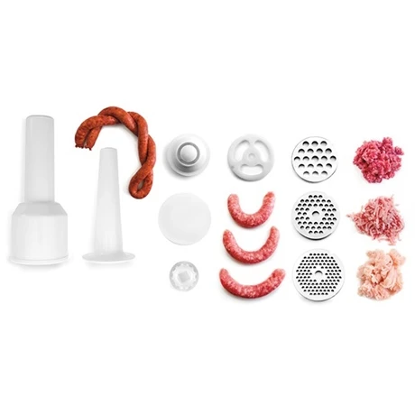 Vous aurez, avec le hachoir, tout le nécessaire pour faire des saucisses mais aussi 3 grilles amovibles pour choisir la finesse de votre viande hachée. Les grilles sont en acier inoxydable, très résistantes à un usage fréquent. Le plateau aussi est amovible afin de faciliter le nettoyage et le rangement.