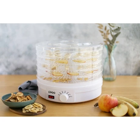 D’un diamètre de 33 centimètres, le déshydrateur dispose d’un thermostat. Il est livré avec cinq plateaux modulables et un récupérateur d’eau pour fruits et légumes très juteux.